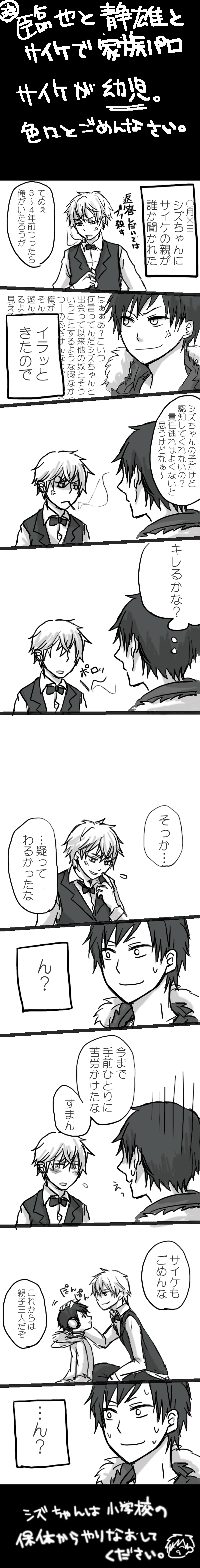 一個前の漫画の続きです。 続きっていうか、同じシリーズ。 シズちゃんに認知してもらいました編。 最近乙女フィルターかかりまくりで、一瞬臨也さんなら産めるんじゃねぇの…?とトチ狂ったこと思ってしまいましたが、このシリーズはそういうSFは、無い…! 臨也さんはいたってふつうの痛い系男子だよッ!! じゃあサイケたんはどこから来たんだろう・・・。